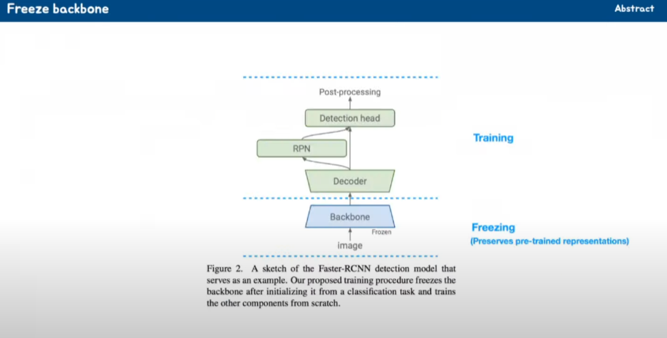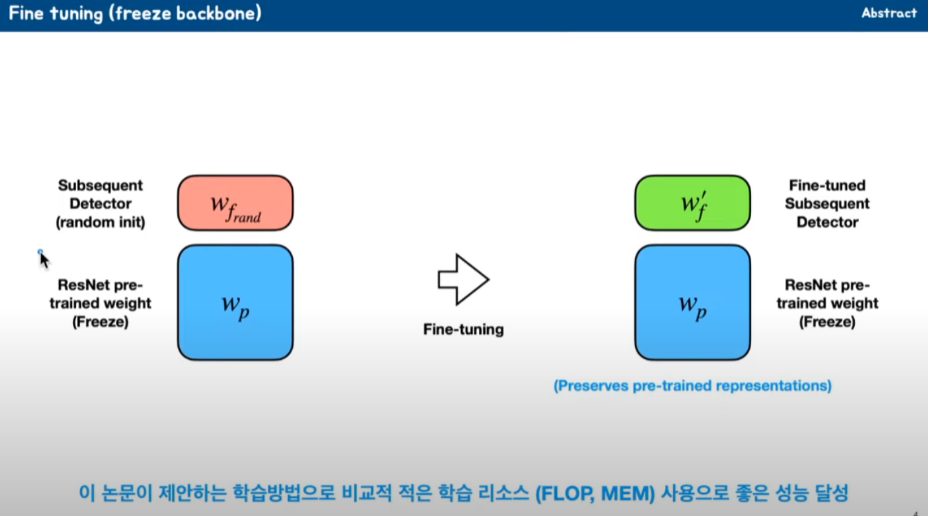 다음은 이 논문에서 제안하고 있는 것들입니다. 보시면 Pre-train 된 weight를 쓰고 그다음에 Detector를 추가한 다음에 이 아래쪽에 있는 Pre-training은 freezing을 하게 됩니다. 그리고 Fine-tuning 하게 되면 여기는 freezing 됐기 때문에 학습되지 않았을 거고 새로 추가된 Detector만 학습되는 결과를 볼 수 있습니다. 이렇게 되면 여기서 Pre-train 된 representation는 계속 유지가 됩니다. 이 논문이 제안하는 학습방법인데 이러면 아래쪽이 학습이 안 되기 때문에 resource로 학습을 할 수 있으면서도 그다음에 좋은 성능을 달성할 수 있다고 주장하고 있습니다.
