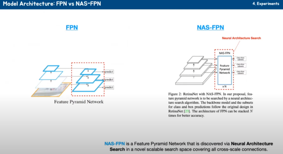 실험에 들어가기 전에 몇 가지 좀 필요한 것들이 있어서 정리하고 가겠습니다. FPN이라고 하면 보통 이렇게 backbone 네트워크에서 나온 것들을 Upsampling 해 가면서 어떤 특징을 추출해서 그거 가지고 예측하는 게 FPN입니다. NAS-FPN는 인공지능을 이용해서 Neural architecture search를 이용해서 인공지능이 Neural 네트워크를 구성하도록 했다고 합니다.