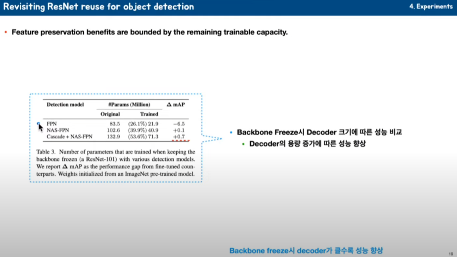 freeze 한 것들이 성능이 지속적으로 좋아지는 것 들을 볼 수 있습니다. 그렇지만 NAS-FPN 보다는 Cascade를 추가한 게 가장 좋은 성능향상을 보이고 있는 것을 볼 수 있습니다. 이걸 어떻게 볼 수 있냐면 backbone을 freeze 했기 때문에 추가되는 decoder 네트워크가 좀 더 크고 어떤 정보를 담기에 충분하게 어느 정도 파야지 잘 된다라고 decoder 좀 커져야 잘 된다고 얘기를 하고 있습니다.