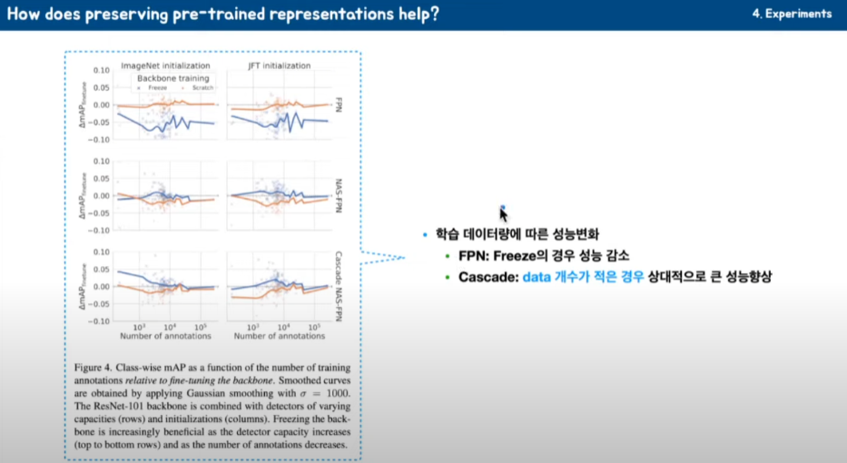 데이터양이 늘어날 때 어떻게 되는지 비교해보고 있는데 ImageNet으로 학습했을 경우, JFT를 학습했을 경우 보시면 FPN의 경우는 backbone을 freeze 한 게 성능이 낮은데 Cascade 보시면 아래쪽에서 조금 더 성능 항상이 있는 것을 볼 수 있습니다.