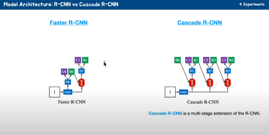 Faster R-CNN의 마지막 네트워크입니다. Cascade R-CNN은 이렇게 Detector 네트워크를 여러 개 두어서 multi-stage로 추론해 낼 수 있고, bounding box나 클래스를 추론해 낼 수 있도록 하는 것이 Cascade R-CNN입니다.