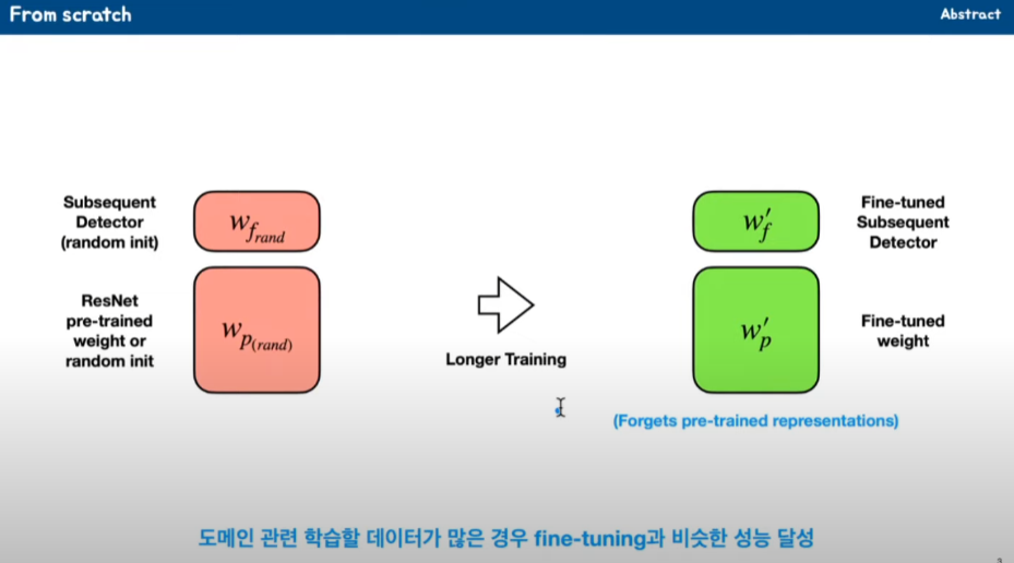 다음은 다른 방법입니다. 여기서는 Detector가 있는데 추가적으로 backbone을 붙일 때, ResNet을 붙일 때 Pre-train을 붙일 수도 있고 아니면 랜덤 하게 초기화할 수 있고 이렇게 해서 모델을 만든 다음에 training을 오래 하고 나서 이때 나오는 Fine-tuning 된 weight나 Pre-train weight를 가지고 이렇게 하는 방법도 있습니다.