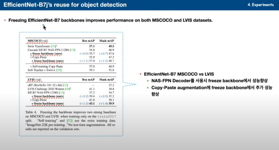 지금까지 RCNN계열이었고 EfficientNet으로 했을 때 보시면 MSCOCO 하고 LVIS에 대해서 봤습니다. 이때 NAS-FPN을 추가했을 때가 좋은 성능을 보이고 있습니다. freeze 했을 때 성능 향상이 되고 있는데 Copy-Paste augmentation을 쓰고