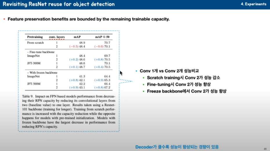 FPN 대신에 Convolution을 한 개 또는 두 개 아주 극단적인 테스트를 해봤습니다. Scratch로 training 했을 때는 오히려 Convolution layer가 커지면서 성능이 감소하는 것들을 볼 수 있습니다. 다음에 Fine-tuning 했을 때 보시면 ImageNet을 학습했을 때나 JFT를 학습했을 때나 Convolution layer가 커지면 성능향상이 있는 걸 볼 수 있습니다. 마찬가지로 freeze 했을 때도 Convolution이 커지면 좀 더 성능향상이 많이 되는 것을 알 수 있습니다.