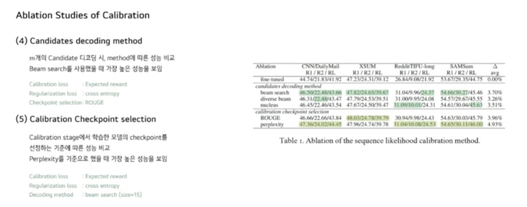 다음으로 candidate decoding 메서드와 checkpoint selection에 따른 성능입니다. m개의 candidate를 decoding 할 때 메서드에 따른 성능을 비교한 것입니다. beam search를 사용했을 때 가장 성능이 높았고 또 checkpoint selection은 perplexity를 기준으로 했을 때 가장 높은 성능을 보였습니다.