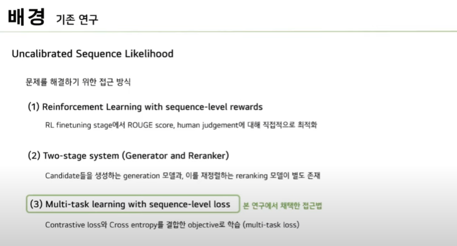 마지막으로 본 연구에서 채택한 방식입니다. Sequence level의 Loss를 활용하는 것입니다. 이전 SOTA 연구에서는 Candidate 간의 Contrastive learning을 위한 Contrastive Loss와 기존의 cross entropy를 결합한 objective를 multi task Loss라고 명시를 했었습니다. 여기서 multi task는 서로 다른 역할을 하는 Loss를 결합하여 학습에 사용한다고 이해했습니다.
