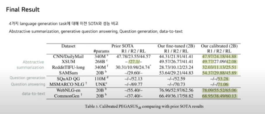 최종 결과입니다. 네 가지 Language Generation task에 대해서 이전 SOTA와의 성능을 비교한 것입니다. 각 데이터셋에서 가장 높은 성능을 초록색으로 칠하였고 보시는 것과 같이 대부분에서 SOTA를 달성하였음을 알 수 있습니다.