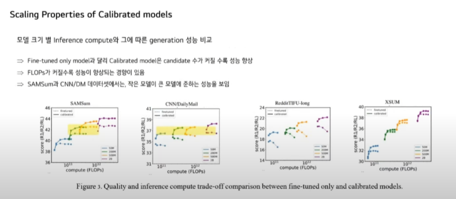 모델 크기별 모델 연산량과 그에 따른 Generation 성능을 비교한 것입니다. Fine tuned only 모델과 달리 Calibrated 모델은 candidate 수가 커질수록 성능이 향상됩니다. 또한 FLOPs가 커질수록 성능이 향상되는 경향을 보입니다. 앞에 SAMSum과 CNN/DM 데이터셋에서는 Calibration 모델에서 더 작은 모델이 큰 모델에 준하는 성능을 보이기도 했습니다.