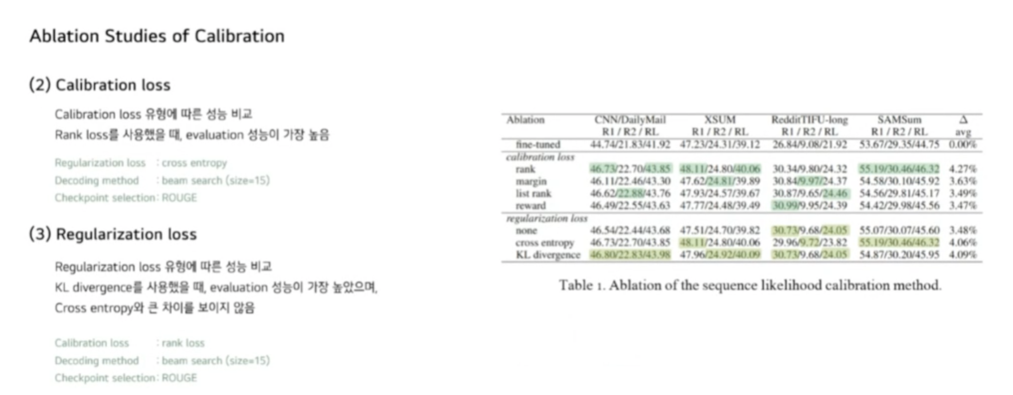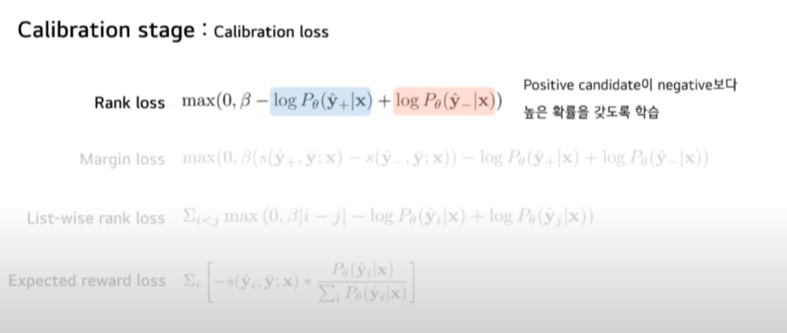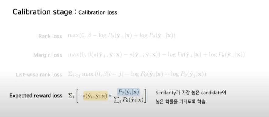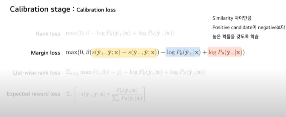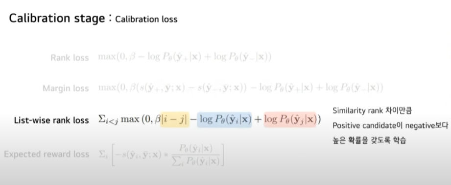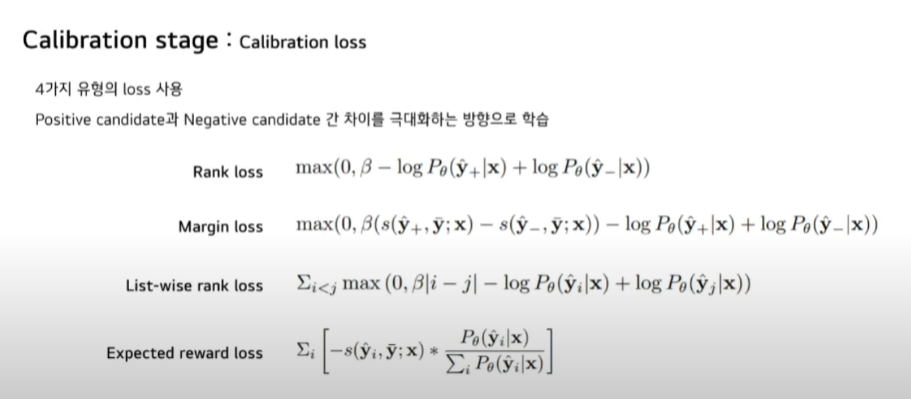 Calibration Loss입니다. 네 가지 유형으로 구분됩니다. 네 개 Loss 모두 target Sequence와 유사한 positive candidate과 target과 좀 다른 negative candidate 간의 차이를 극대화하는 방향으로 학습합니다.