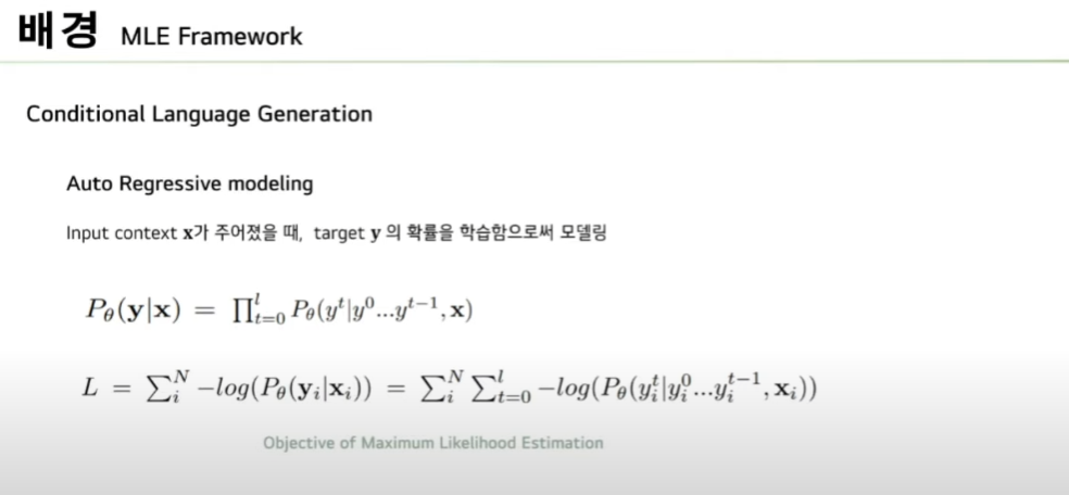 먼저 Conditional Language Generation task는 Input context Sequence x가 주어졌을 때 target SequenceY의 확률을 학습함으로써 모델링합니다. 이때 생성 가능한 모든 text Sequence의 확률을 계산하는 것은 힘들기 때문에 Auto regressive 하게 순차적으로 token level prediction을 수행하며 이 과정에서 Maximum Likelihood Estimation을 학습 objective로 활용합니다.