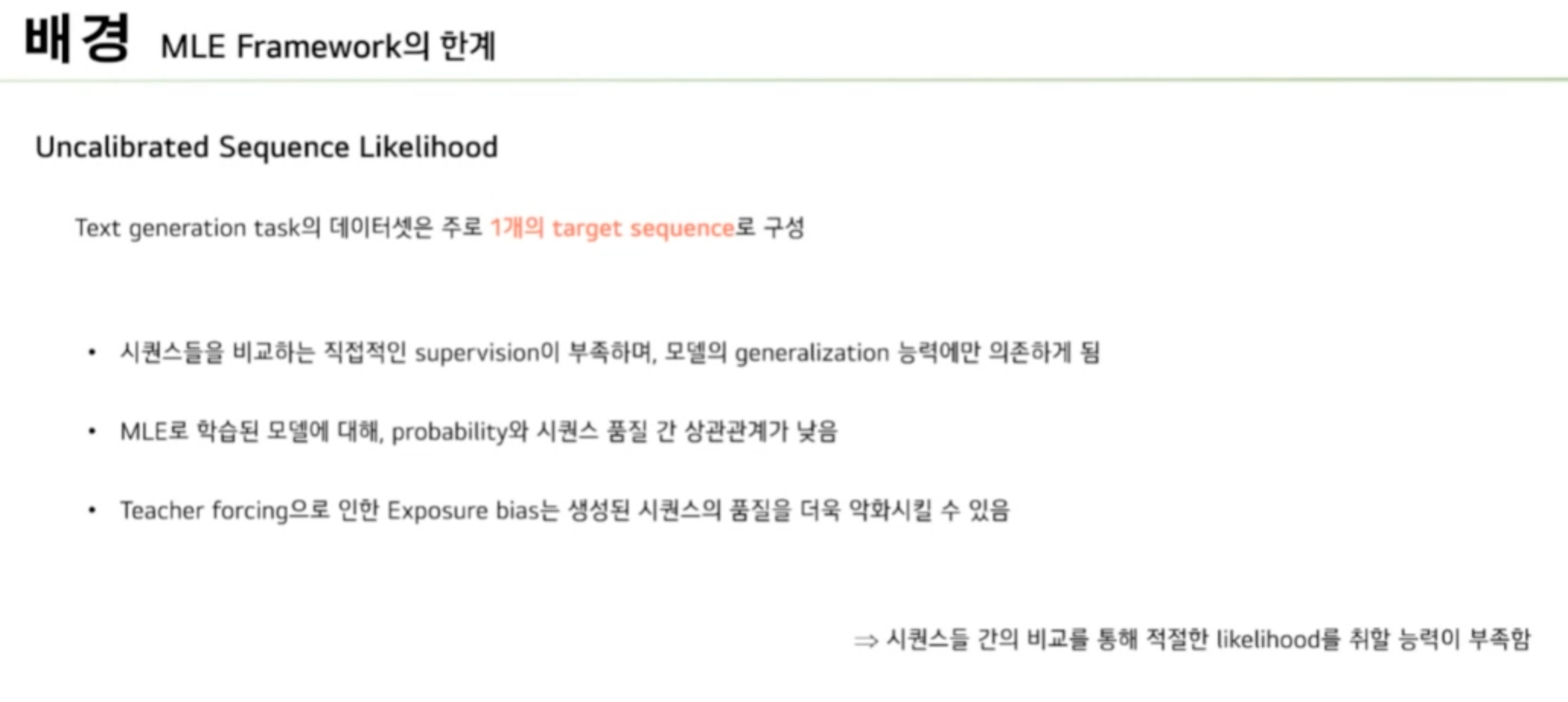 또한 MLE framework의 경우 Teacher forcing을 이용하기 때문에 학습과 추론의 차이로 인한 exposure bias가 존재합니다. 이러한 exposure bias로 인해 Sequence 품질 저하가 더욱 악화될 수 있습니다. 정리를 하자면 MLE framework로 학습된 모델은 Sequence 간에 비교를 통해서 Likelihood을 교정할 능력이 부족합니다.