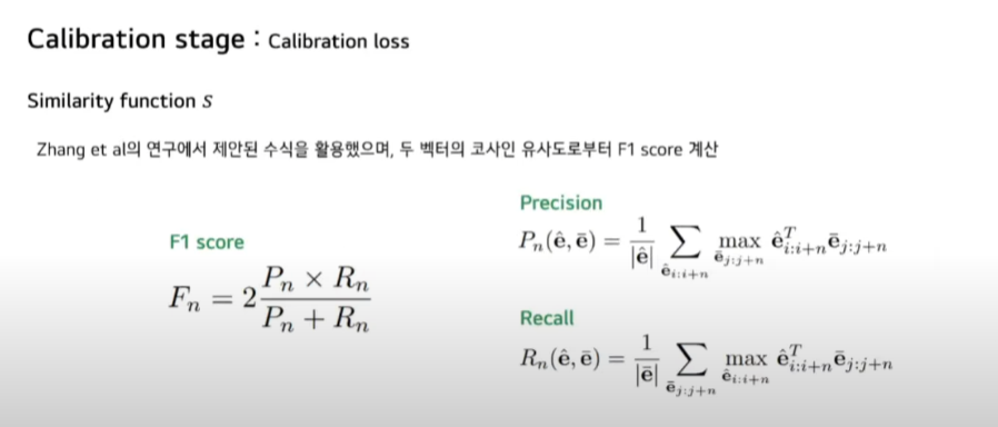 Decoder hidden state 간의 코사인 유사도로부터 F1 스코어를 계산한 값이 두 Sequence 간의 유사도입니다. precision과 Recall은 다음과 같습니다. 여기서 vector e는 decoder hidden state이며 span n에 대해서는 유사도를 계산합니다.