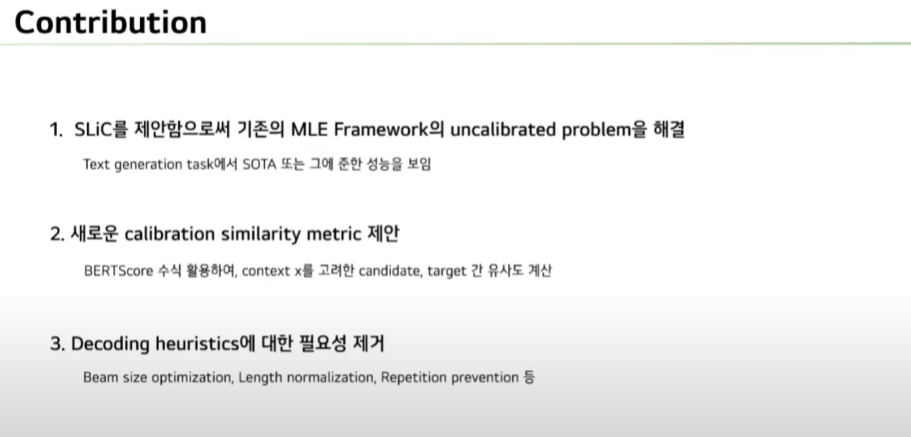 마지막으로 논문의 Contribution을 정리한 것입니다. Calibration stage를 추가함으로써 기존의 MLE framework의 uncalibrated 문제를 해결하여 SOTA 또는 그에 준하는 성능을 보였습니다.