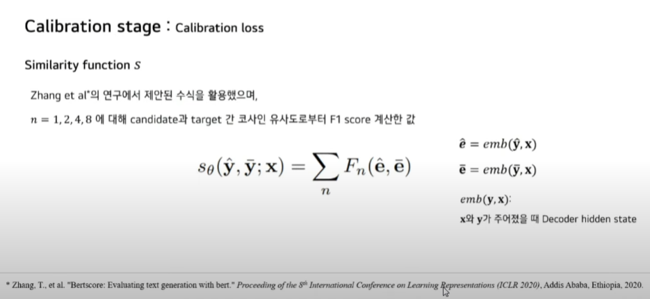 Calibration Loss에 대해 말씀드리겠습니다. 먼저 본 논문에서 새롭게 제안한 similarity function입니다. 2020년 ICLR에서 발표한 BERT 스코어 연구에서 제안된 수식을 활용하였습니다. 해당 연구에서는 Sequence를 BERT를 통해 embedding 한 representation 간의 유사도를 계산하였지만 본 연구에서는 decoder의 hidden state를 활용했습니다. 이를 통해 Input context x를 고려한 representation을 취할 수 있습니다.