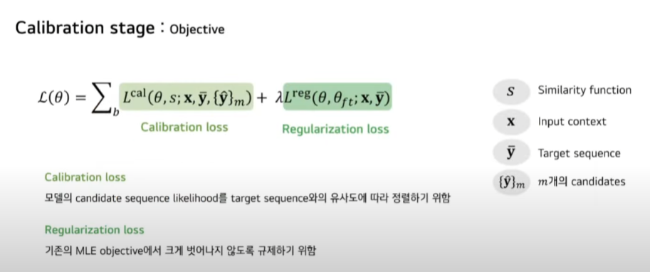 새로운 Objective는 Calibration Loss와 Regularization Loss로 구성됩니다. 먼저 Calibration Loss는 모델이 decoding 한 candidate Sequence들이 있는데 이들의 Likelihood를 candidate Sequence와 target Sequence 간에 유사도에 따라 정렬하기 위한 Loss입니다. 이 유사도를 계산하기 위해 similarity function을 포함합니다.