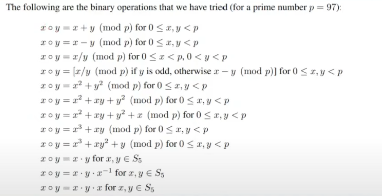 첫 번째 공식 같은 경우에는 소수 97을 기준으로 97 미만의 정수 x와 y를 고른 후 x와 y를 다음 값으로 97을 나눈 나머지 값이 정답에 해당이 됩니다. 그리고 가장 마지막에 있는 공식은 S5까지의 순열에 속하는 정수니까 1에서 24까지 입니다. 정수 x와 y 중에서 x와 y를 곱한 후 다시 x를 곱한 값이 정답 레이블에 해당됩니다.