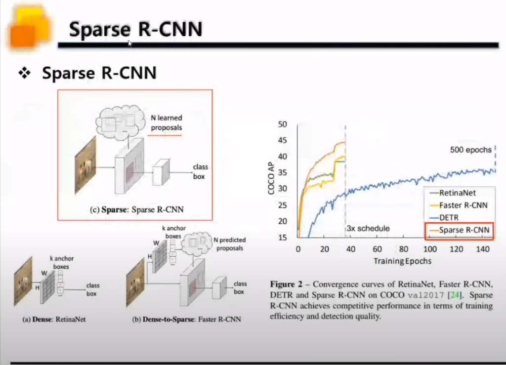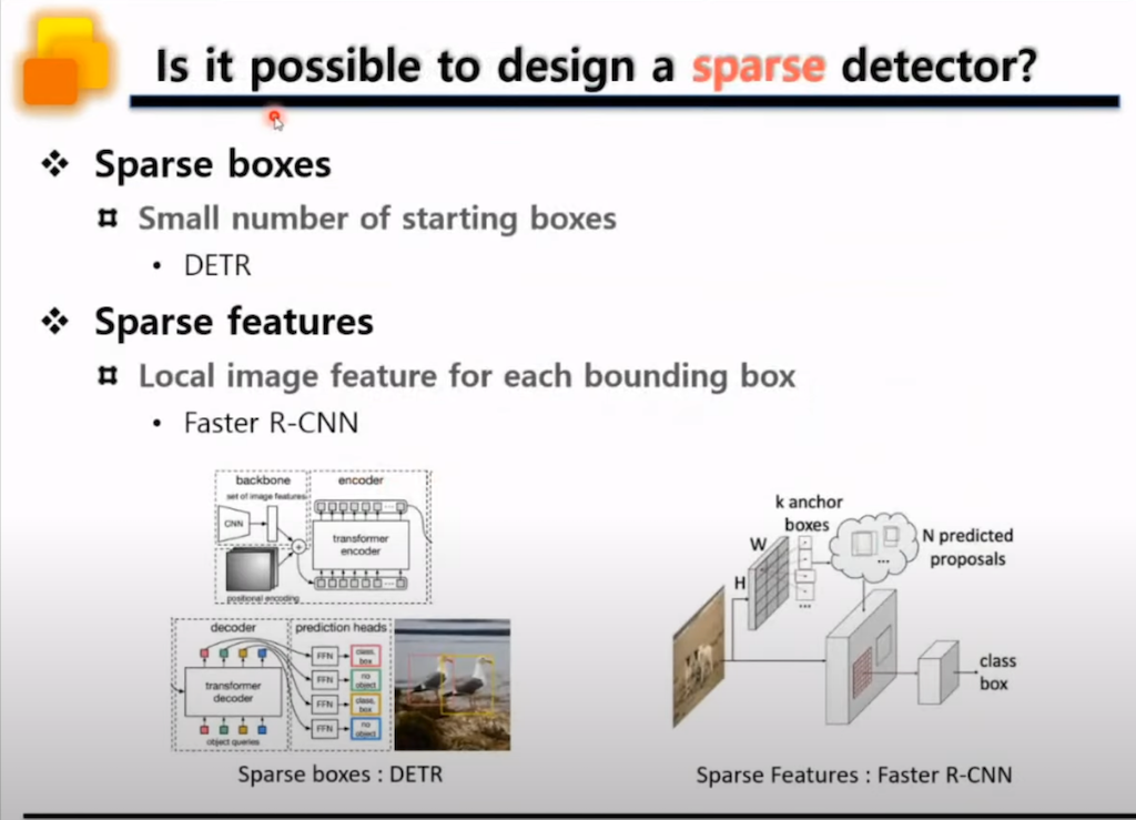 기존의 이러한 문제들에 대한 인식과 해결하고자 하는 움직임이 있었습니다. 그중 가장 대표적인 것이 DETR이었고, DETR이 바운딩 박스 개수를 굉장히 적게 가져가는 동시에 성능을 높게 달성할 수 있는 트랜스포머 구조를 제안을 하게 됩니다. 그리고 Faster R-CNN는 Sparse 한 피쳐 사용에 대해서 가장 대표적인 논문이라고 보시면 될 것 같습니다.