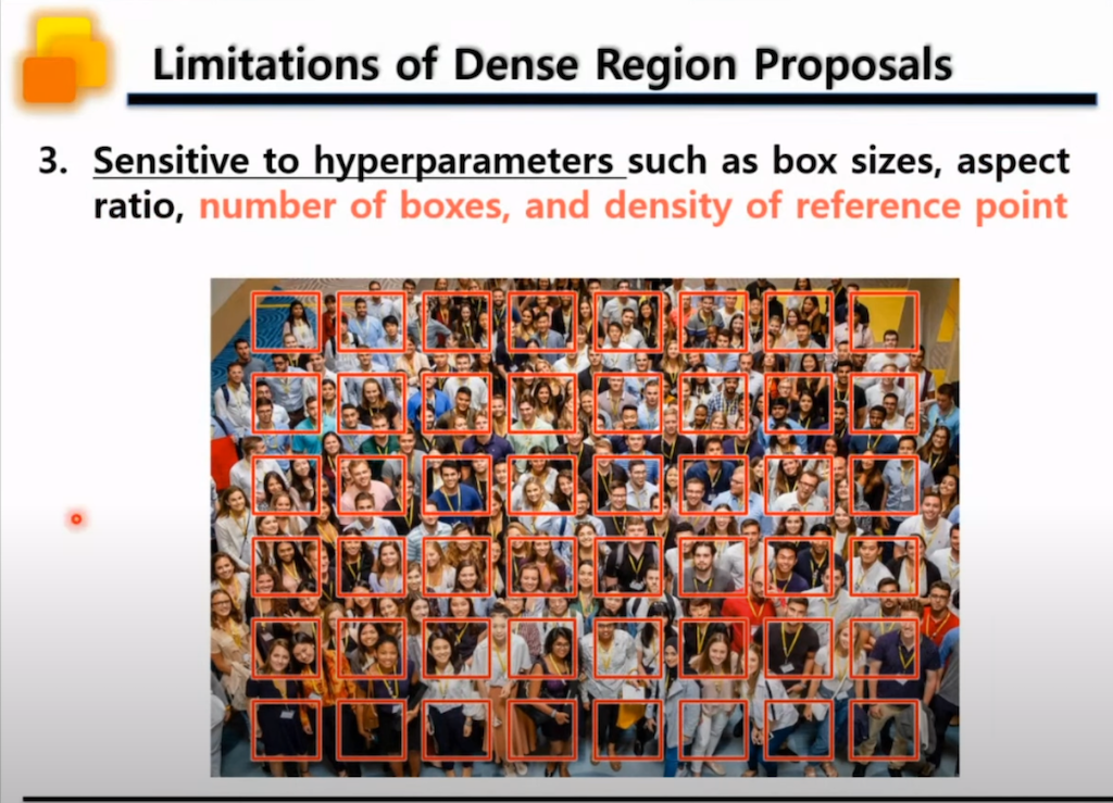 마지막 단점으로, 크라우드 디텍션 같은 경우에 Region proposal를 사용자 입장에서 나름 촘촘하게 뿌린다고 해서, 이렇게 많은 수의 사람들이 한 번에 탐지하기에는 굉장히 어렵다는 문제가 있습니다.