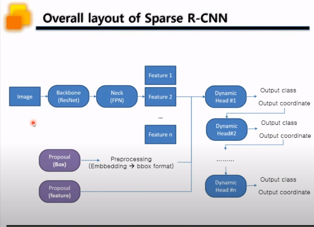 Sparse R-CNN의 구조를 보겠습니다. 일단 이미지가 피처 익스트렉터인 백본 네트워크를 통과하게 되고 통과하게 된 피처 맵을 FPN을 이용해서, 해상도별로 최적화되어있는 피처 맵을 이렇게 생성을 하게 됩니다. 그리고 이 피처 맵에서 그다음 단계인 Dynamic head 단계로 넘어가게 되는데, 그때 삽입이 되는 두 가지가 proposal 박스와 proposal feature입니다. proposal 박스가 region proposal 역할을 하는 것이고, proposal 피쳐가 성능을 올린다고 보시면 될 것 같습니다. 그 후 다이내믹 헤드로 입력이 되게 되고 첫번째 나오는 그 아웃풋 클래스와 아웃풋 coordinate를 반복적으로 사용 하게 됩니다. 그래서 이렇게 겹겹이 쌓여있는 다이나믹 헤드들을 사용하게 되고 최종적으로, 마지막 사용자의 그 선택에 따라서 달라지는데, 최종층의 아웃풋을 디텍터의 아웃풋으로 사용을 하게 됩니다.