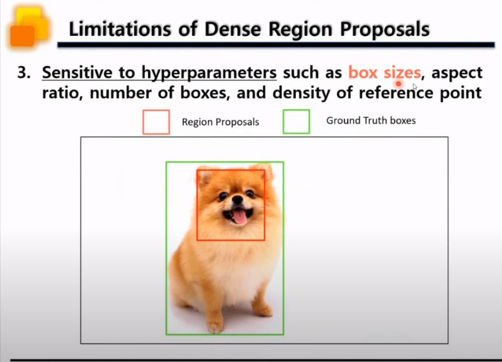 또한 하이퍼 파라미터에 굉장히 민감한 문제가 있습니다. 예시로 박스 사이즈, 가로세로 비율, 박스 개수 그리고 이 앵커를 얼마나 촘촘하게 뿌릴 것인가에 대한 문제들이 있습니다. 그래서 예를 들어 위 이미지 같은 경우에 그라운드 트루스가 있다고 하면 Region proposal들이 이렇게 큰 그라운드 트루스 박스랑 매칭 되기가 어렵습니다.