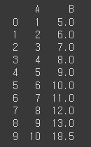 'A'와 'B' 두 개의 열(column)이 있습니다. 'B'칼럼에 이상치(outlier)가 포함되어 있습니다.